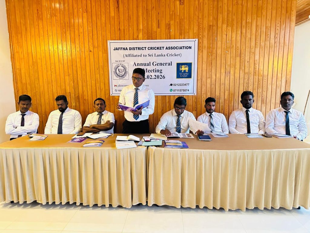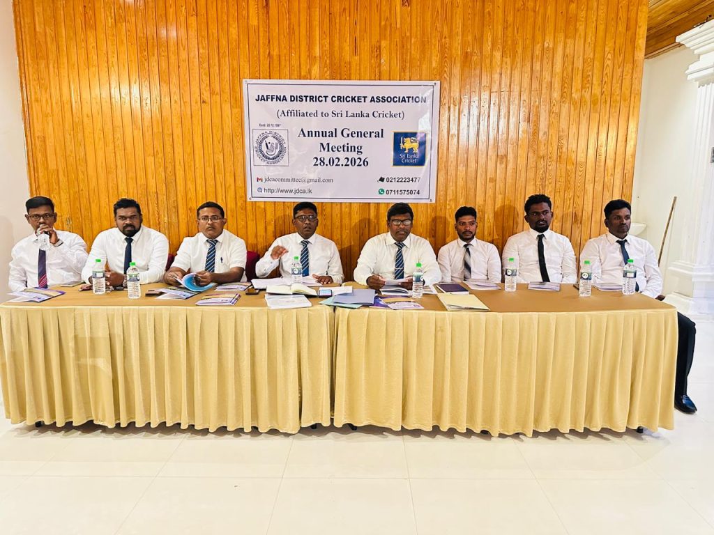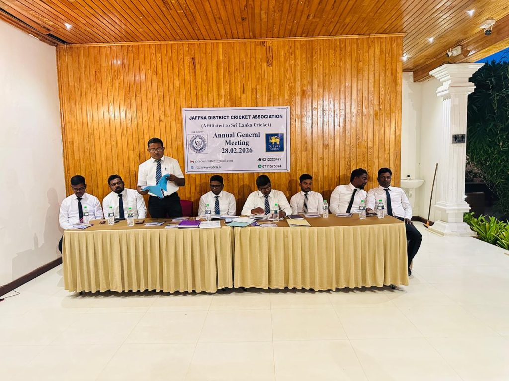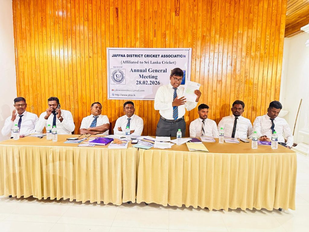 The Annual General Meeting (AGM) of the Jaffna District Cricket Association for the year 2026 was held at the J Guest Hotel on February 28, 2026, at 5:30 P.M. The meeting was attended by the Office Bearers, 24 Affiliated Club Representatives, Office Staffs, and the District Coach.
