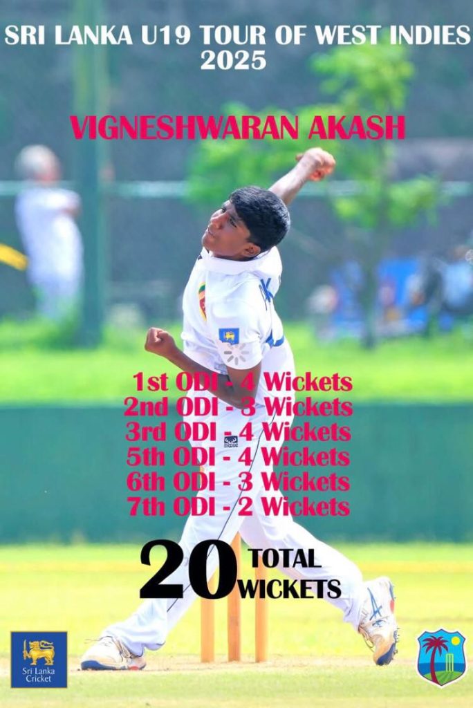 Vigneswaran Akash named the Leading wicket taker of U-19 West Indies Tour 2025.